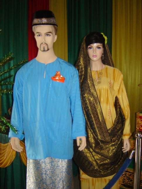 Baju laki-laki mengenakan atasan berwarna biru langit, model teluk belanga (berkolar bulat, berkancing satu di tengah dada), mencerminkan kesederhanaan dan kepraktisan dalam berpakaian. Dengan bawahan kain sampin bercorak tenun songket atau kain bertekstur perak keabu-abuan, dikenakan dengan rapi di bagian pinggang.