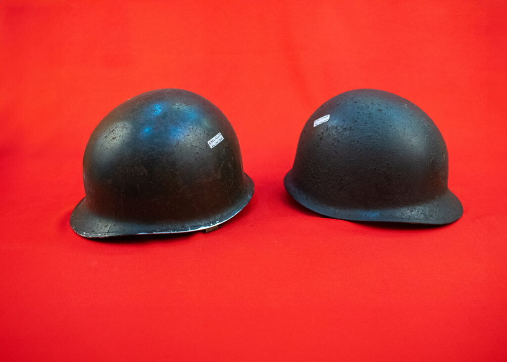 Berbentuk bulat sedikit oval (seperti topi). Permukaannya dicat warna hijau lumut, terdapat tali pengikat. Penutup kepala yang dikenakan pada masa penjajahan Belanda